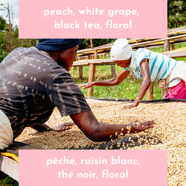 Les cerises de café sont soigneusement cueillies à la main lorsqu'elles sont mûres et livrées à la station de lavage le jour même pour le traitement. Le procédé de lavage commence par le dépulpage et une période de fermentation sèche de 24 heures, suivi d'un lavage et d'un trempage dans de l'eau propre. Le café est ensuite séché méticuleusement sur des tables de séchage surélevées, garantissant un procédé lent qui empêche le parchemin de se fissurer.
