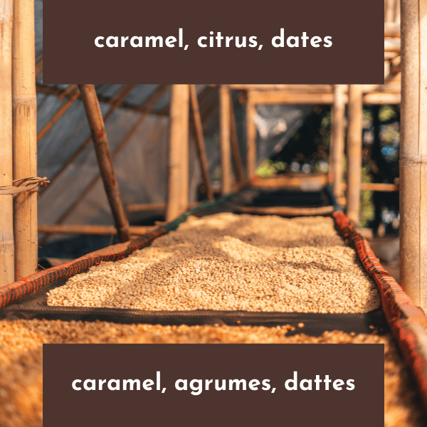 Le procédé commence par la récolte sélective des cerises de café mûres, qui sont ensuite pulper pour enlever la peau extérieure tout en conservant 20 % de la mucilage. Les cerises sont étalées sur des patios et des lits de séchage surélevés et sont soigneusement surveillées et retournées périodiquement pour assurer un séchage uniforme pendant plusieurs semaines. À mesure que la mucilage sèche, elle prend une teinte blanche, indiquant la teneur en sucre et le niveau de fermentation. Une fois séchée à la teneur en humidité souhaitée, la mucilage est enlevée, et les grains sont triés et laissés au repos pour stabiliser l'humidité et faire mûrir les saveurs.